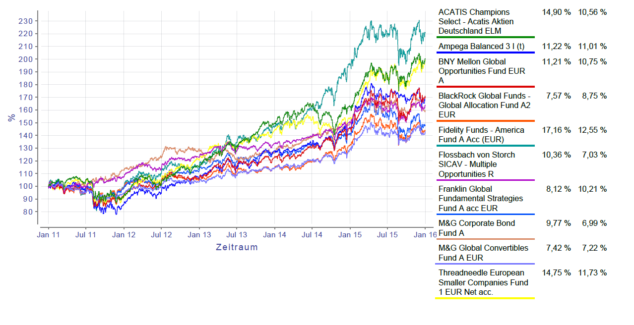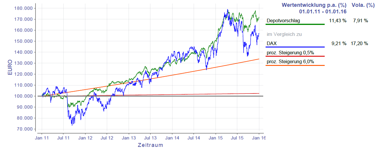 Zum 01. Januar 2011 mit einem virtuellen Betrag von 100.000 Euro ausgestattet, erhalten Sie einen Überblick über beispielhafte Depotvariante „dynamisch“. Der empfohlene Anlagehorizont beträgt mindestens 7 Jahre aufwärts. Die angestrebte Zielrendite bei diesem Depot beträgt 7 % pro Jahr vor Steuern und Kosten. Der maximale Anteil in Aktien sollte bei diesem Depot 70 % nicht überschreiten. Ein Depot für alle die mehr erwarten als nur eine einfache Anlage in Investmentfonds. Wertpapiererfahrung und erhöhte Risikobereitschaft sind jedoch ein Muss für diese Anlagestrategie.